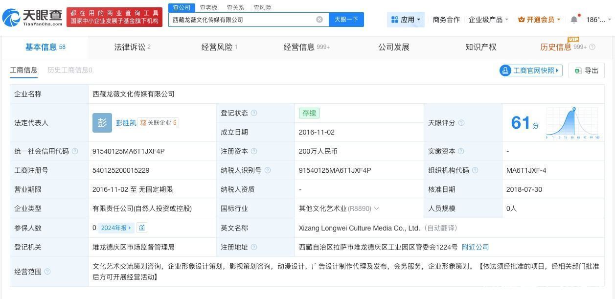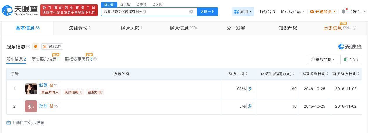 西藏龙薇文化传媒有限公司建造于2016年11月,法定代表东谈主为彭胜凯,注册成本200万东谈主民币,策划鸿沟包括文化艺术相同策划打算、企业形象设战术划、影视策划打算等。鼓动信息表露,该公司由赵薇、孙丹分袂握股95%、5%。