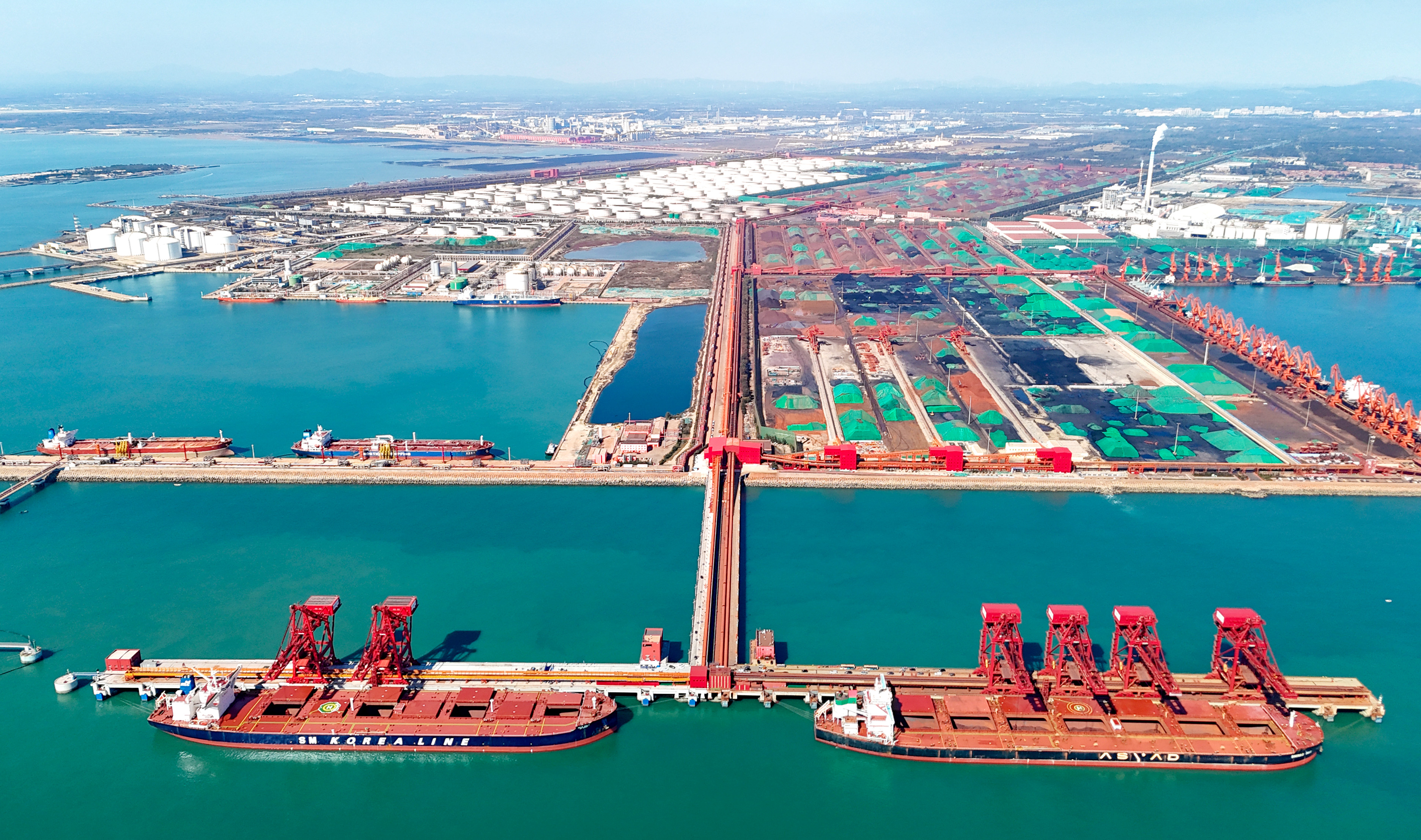在山东青岛拍摄的山东口岸青岛港第二座40万吨矿石船埠(2025年10月27日摄,无东说念主机相片)。新华社发(张进刚摄)