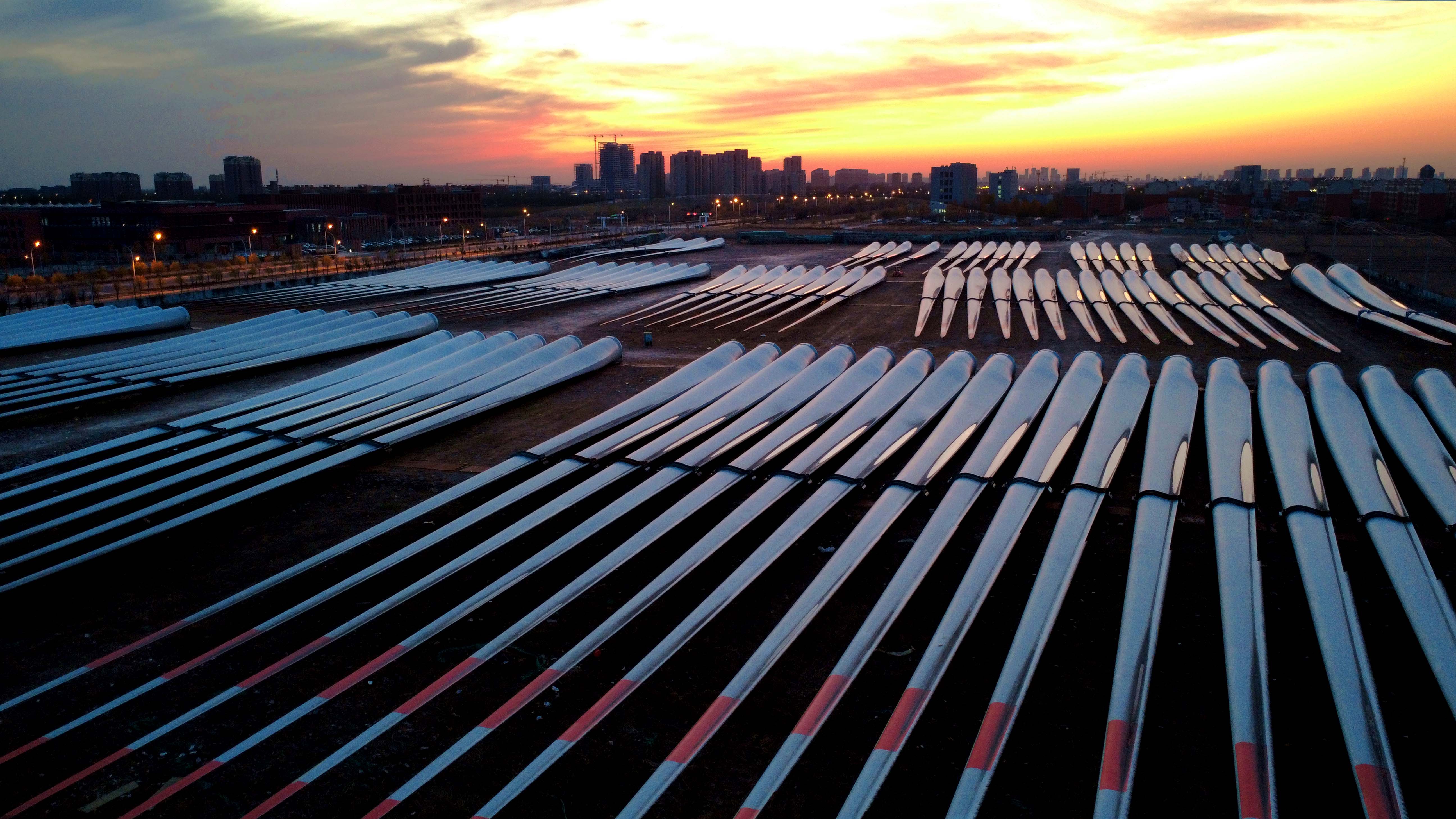 山东省滨州市惠民县风电装备制造产业园叶片堆场(2025年11月19日摄,无东说念主机相片)。新华社记者 郭绪雷 摄